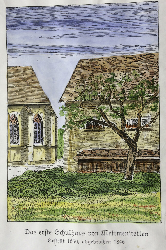Das erste Schulhaus in Mettmenstetten wurde 1650 erstellt und befand sich in einem Spycher östlich der reformierten Kirche. Mitte des 17. Jahrhunderts war Mettmenstetten, die grösste Gemeinde in der Landvogtei Knonau. Bei der der Volkszählung 1634 wurden 542 Einwohner vermerkt. So wurde im Sommer 1650 beschlossen, einen Raum für Bildung zu schaffen.
