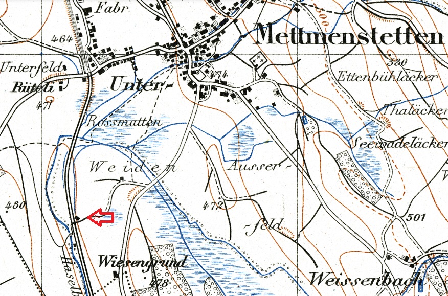 Den Standort in der Mühlistett können sie der Karte entnehmen (anklicken). Der  Flurname Mülistett weist zwar eher auf eine Mühle hin. Der Antrieb  erfolgte durch ein Wasserrad,  mit  Wasser aus dem Haselbach. Dieser wurde gestaut  und durch einen Kanal zur Mühle geleitet und dann zurück in den Bach.  Diese Stauung erfolgte unterhalb des damaligen Einlaufes des  vorderen Dorfbaches in den Haselbach ca. 100 Meter nordwestlich der heutigen Einmündung. Der alte Dorfbach hatte seinen Lauf links vorbei der grossen Eiche, die heute noch mitten in der Rossmatte steht, d.h. eigentlich auf einem künstlichen Damm. So konnten man früher den Bach stauen und das Gelände beidseitig überfluten und damit Streue gewinnen.  Dieser“Damm“ ist heute noch gut sichtbar. Die Bachverlegung erfolgte  im Zusammenhang mit der Melioration ca. 1960.