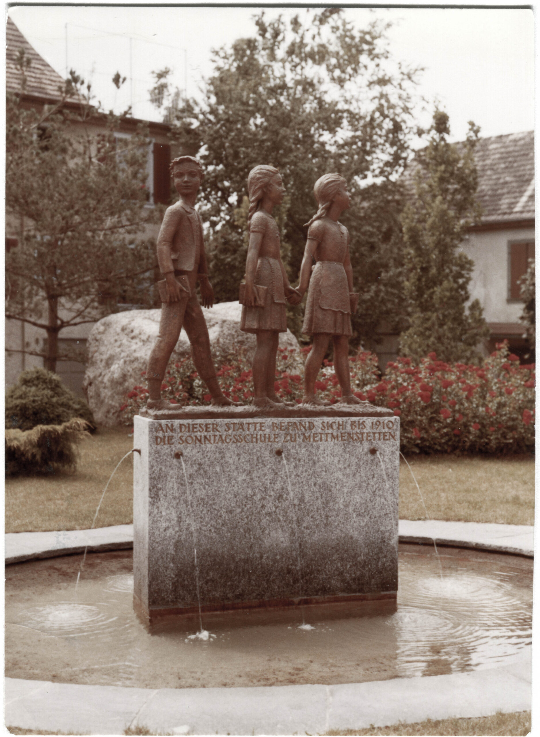 Mitten im Dorf befand sich bis 1910 die Sonntagsschule Mettmenstetten. Der eingemeisselte Schriftzug auf dem Brunnensockel weist darauf hin. Damit ist auch die Rätselfrage, wohin diese Kinder gehen beantwortet – Zur Sonntagsschule.