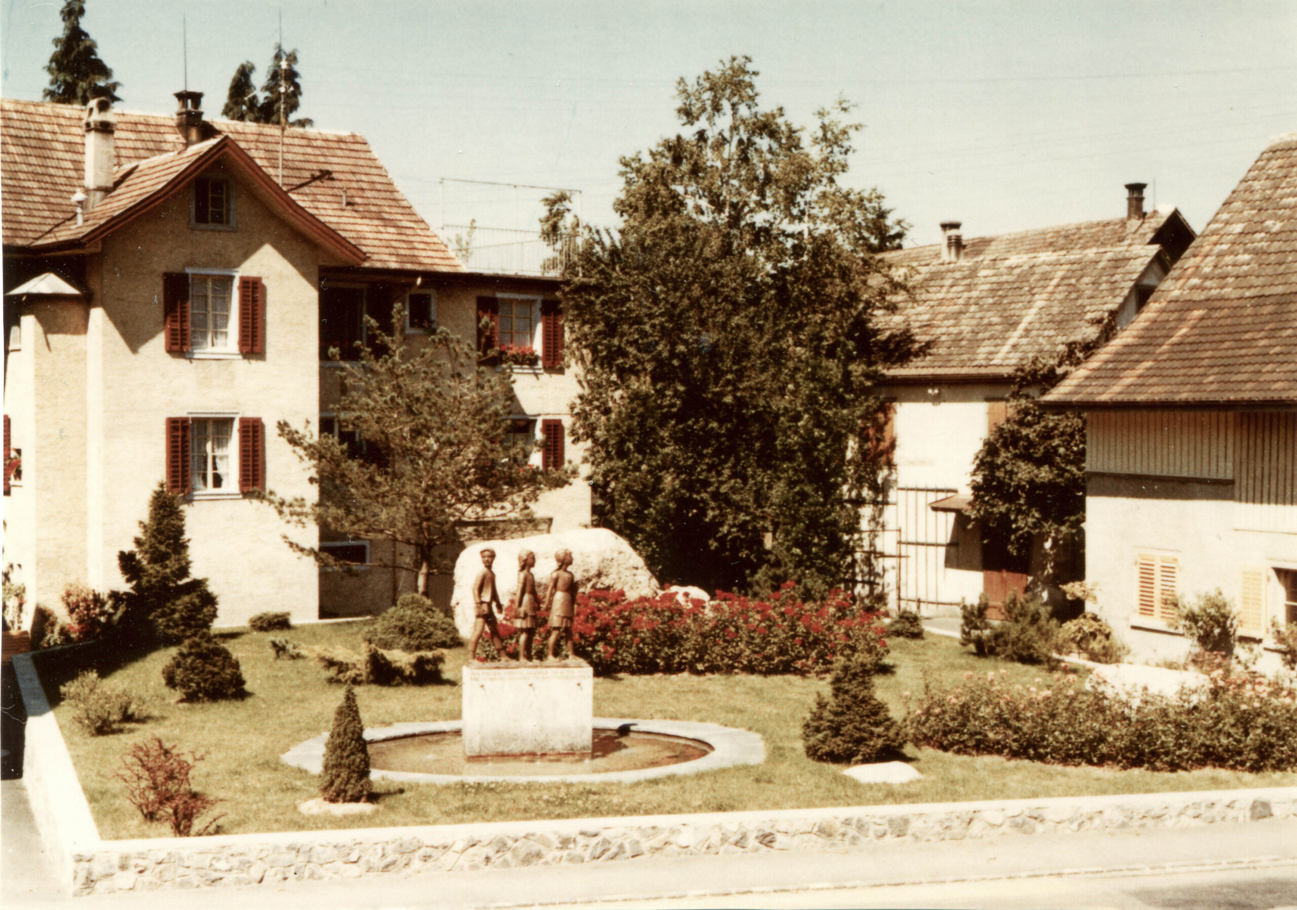 Im oben erwähnten Tages-Anzeiger war weiter zu lesen: In vielen Dörfern unseres Landes sieht man neue Häuser und Fabriken aus dem Boden schiessen; die Hochkonjunktur feiert Orgien auf Kosten der Schönheit und Geschlossenheit des Dorfbildes. In Mettmenstetten zeigt aber ein Beispiel, dass es immer noch Männer gibt, die ihre Heimat wirklich lieben und sich das auch etwas kosten lassen. Ein in Zürich wohnhafter Bürger von Mettmenstetten kaufte am Hauptplatz seines Heimatdorfes ein Areal, auf dem ein baufälliges Haus stand, das dem Dorfbild sicher nicht zur Zierde gereichte. Er liess das alte Haus, in dem er einst die Sonntagsschule besuchte, abbrechen und auf dem gewonnenen Platz einen Brunnen errichten, von dessen Sockel eine durch Bildhauer W. Hürlimann geschaffene Bronze, eine Kindergruppe darstellend, dem Beschauer freundlich entgegenlacht. Hinter dem Brunnen, dessen Wasser in ein blumenumsäumtes Bassin plätschert, liegt ein mächtiger Findling im Gewicht von 22 Tonnen. Diese liebliche Anlage, die jedem Betrachter Freude machen muss, liess der grossherzige Gönner einzig erstellen, weil er dort die Sonntagsschule besuchte und weil sie dem Dorfplatz wirklich zur Zierde gereicht. Als besonders lobenswert darf hervorgehoben werden, dass er das Schmuckstück seiner Heimatgemeinde zum Geschenk machte. Ein solches Beispiel verdient Nachahmung, zeigt es doch, wie Wohlstand, gepaart mit gesunder Heimatliebe, Schönes und Bleibendes zu schaffen vermag. |